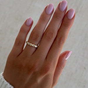 An eternity style band featuring a continuous loop of radiant cut diamonds. Each embraced by their own personal case of gold. The little sibling of the midi bezel set for a more dainty look.