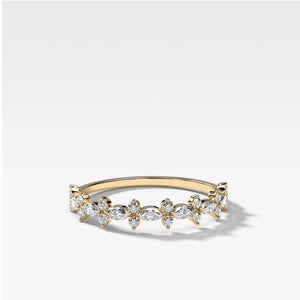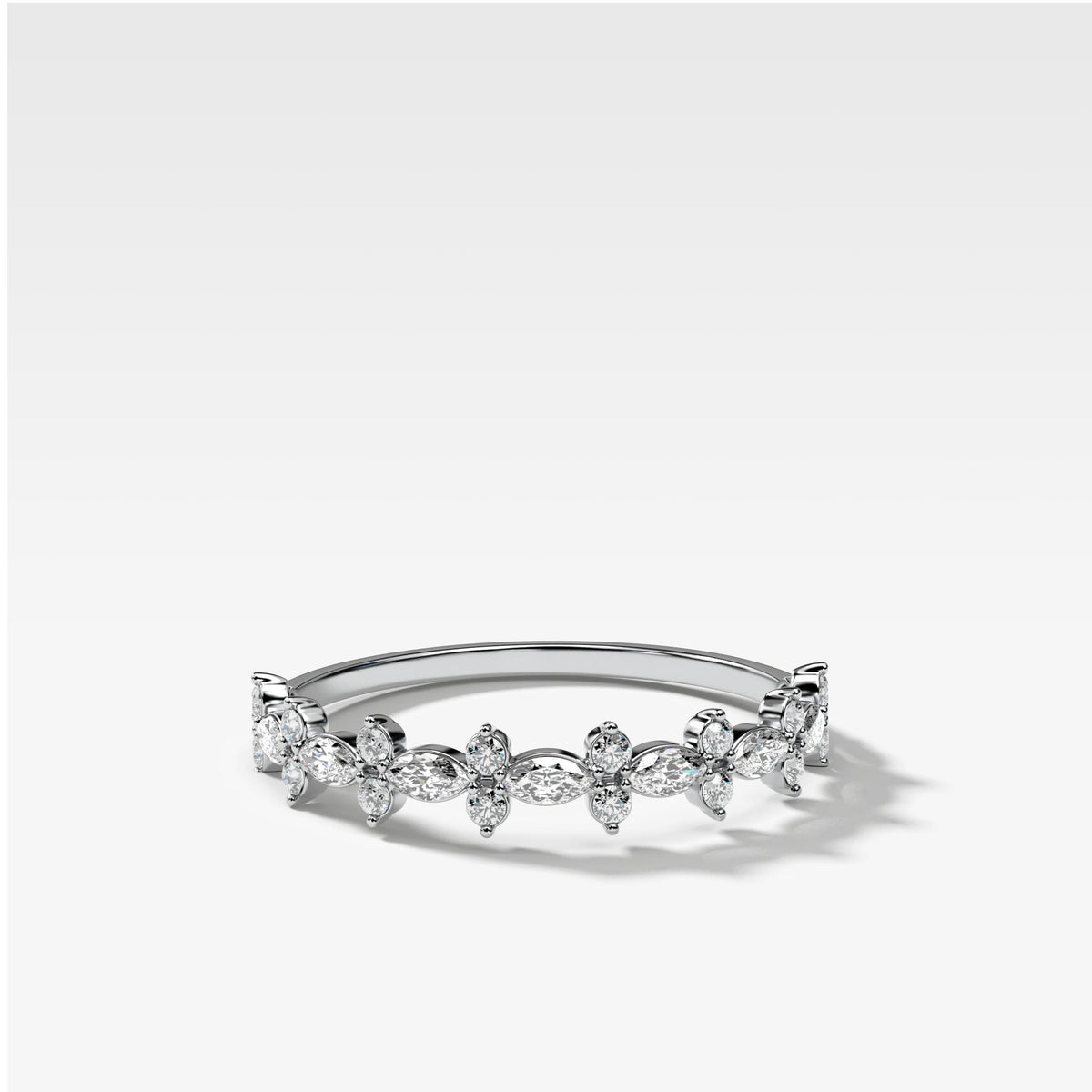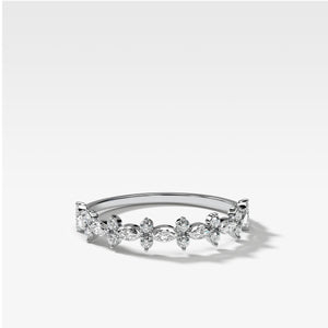 Alternating marquise cut diamonds and round diamond clusters, the Gibbous band uses rotating symmetries to dazzle those fingers. Featured here in the halfway Eternity style.