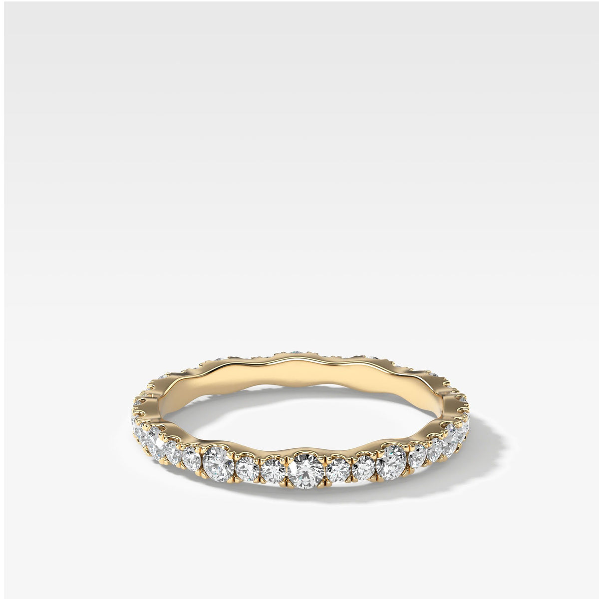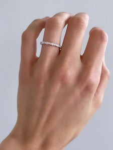 This ring features round diamonds of graduated sizes arranged to emulate a wave pattern. The pavé setting highlights the stunning visual effect of the stones shapes.