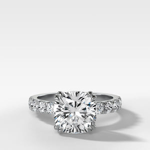An eye-popping center stone is complemented by a host of small round diamonds pavé-set in the shank, for a minimal ring with maximum sparkle.