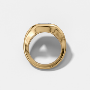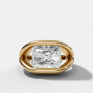 A center diamond rests gracefully between two sculptural bands of precious metal, creating a striking balance of strength and elegance.