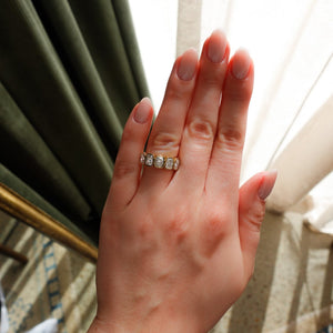 A statement piece comprised of five hand selected Elongated Cushion Cut diamonds with a border of precious metal.