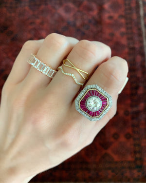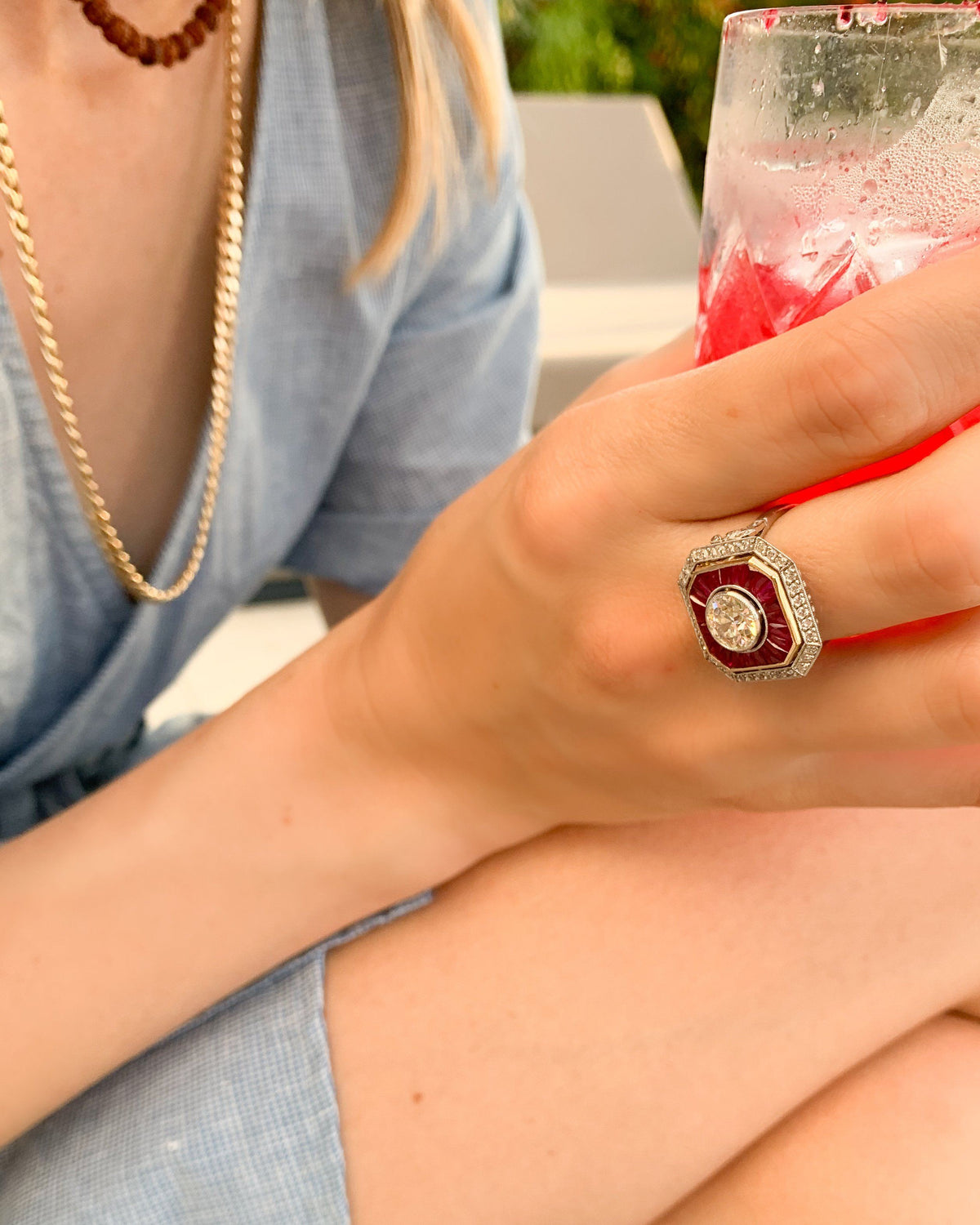 We love halo engagement rings in all shapes and sizes, but sometimes even master jewelers need a moment to catch their breath when they see perfection. This ring design is inspired by an old school, Art Deco gemstone halo. From the delicate milgrain detail and contrasting yellow gold bezel to the custom cut rubies in the first halo, this ring is a halo for people that don't like halos.