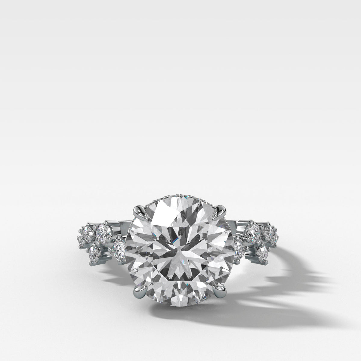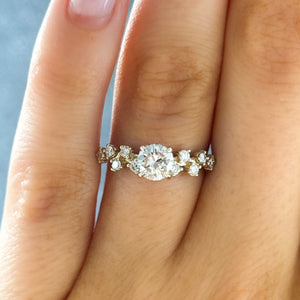 The Starfire features a dazzling center stone complemented by small round diamonds that twinkle like stars, and a hidden halo. This diamond ring exudes celestial beauty and unique intricate charm.