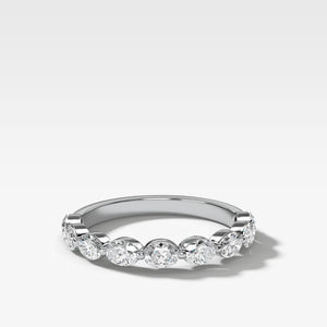 Each oval diamond in this ring shares one prong with the stone beside it, drawing attention to the elegant shape and sparkle of the stones themselves. This band is just like our but with larger diamonds.