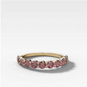 Each of the 11 ideal cut round pink diamonds in this ring shares two bead-head prongs with the stone beside it for maximum proximity and depth of color.