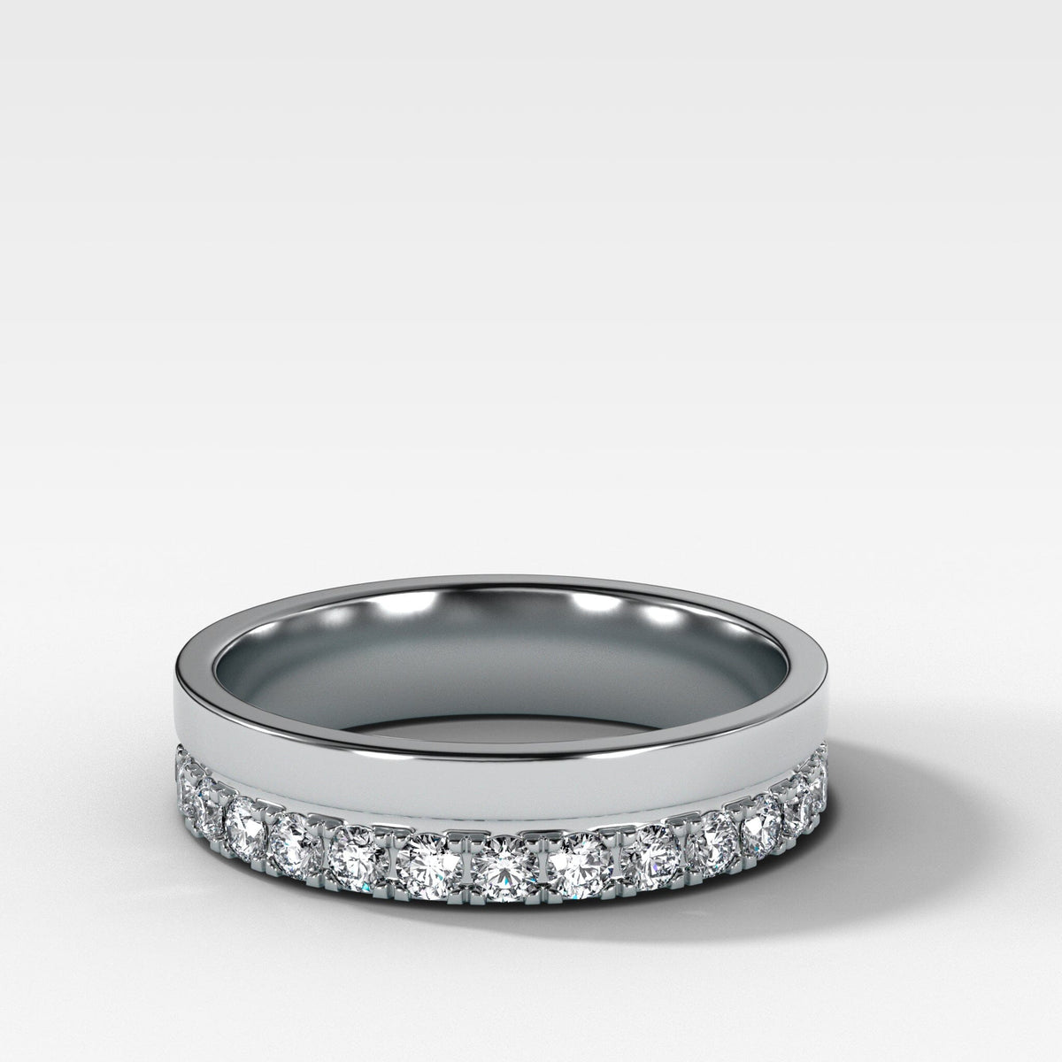 The best of both worlds: A row of delicate pavé diamonds adjoined to a sold gold band. Two stackable rings in one.