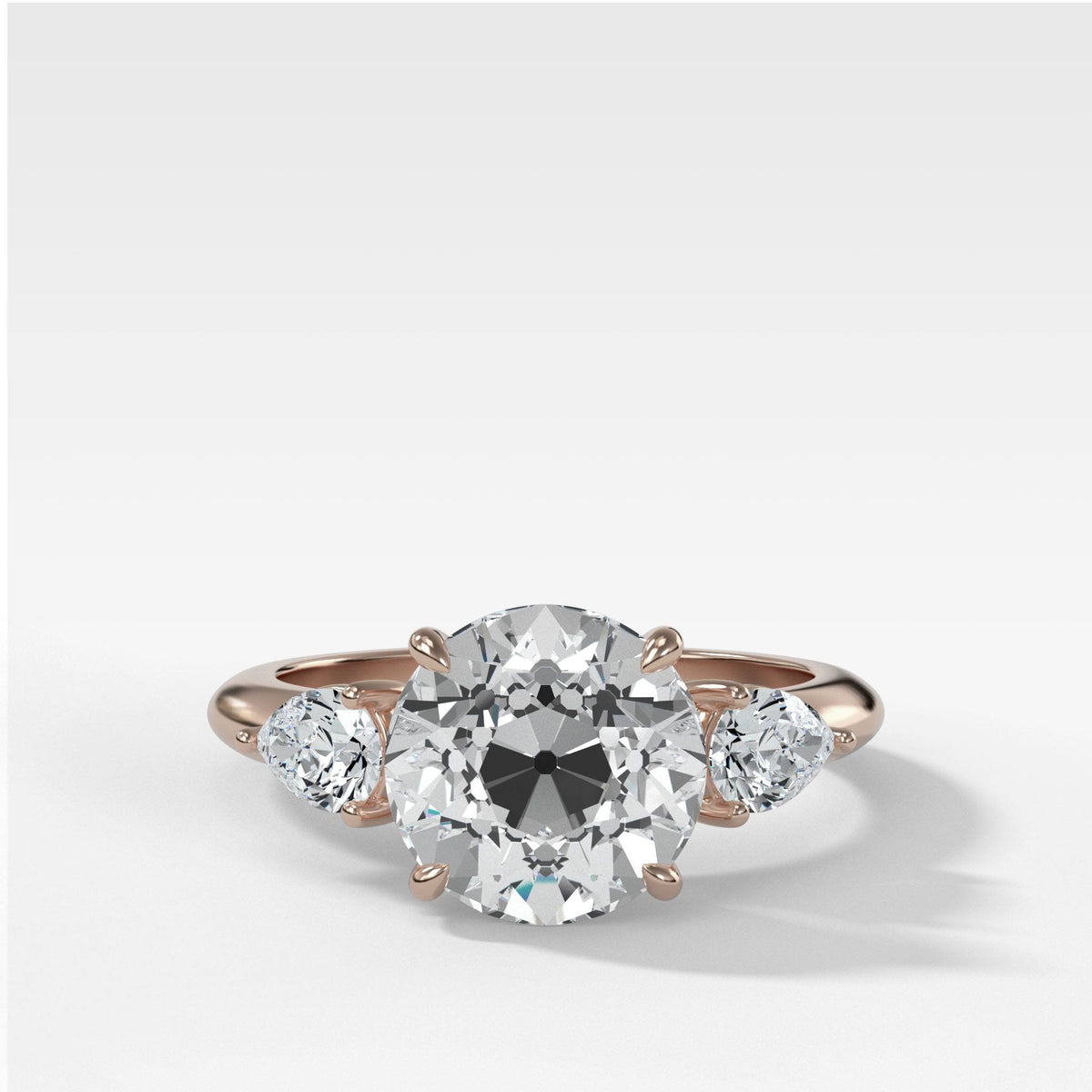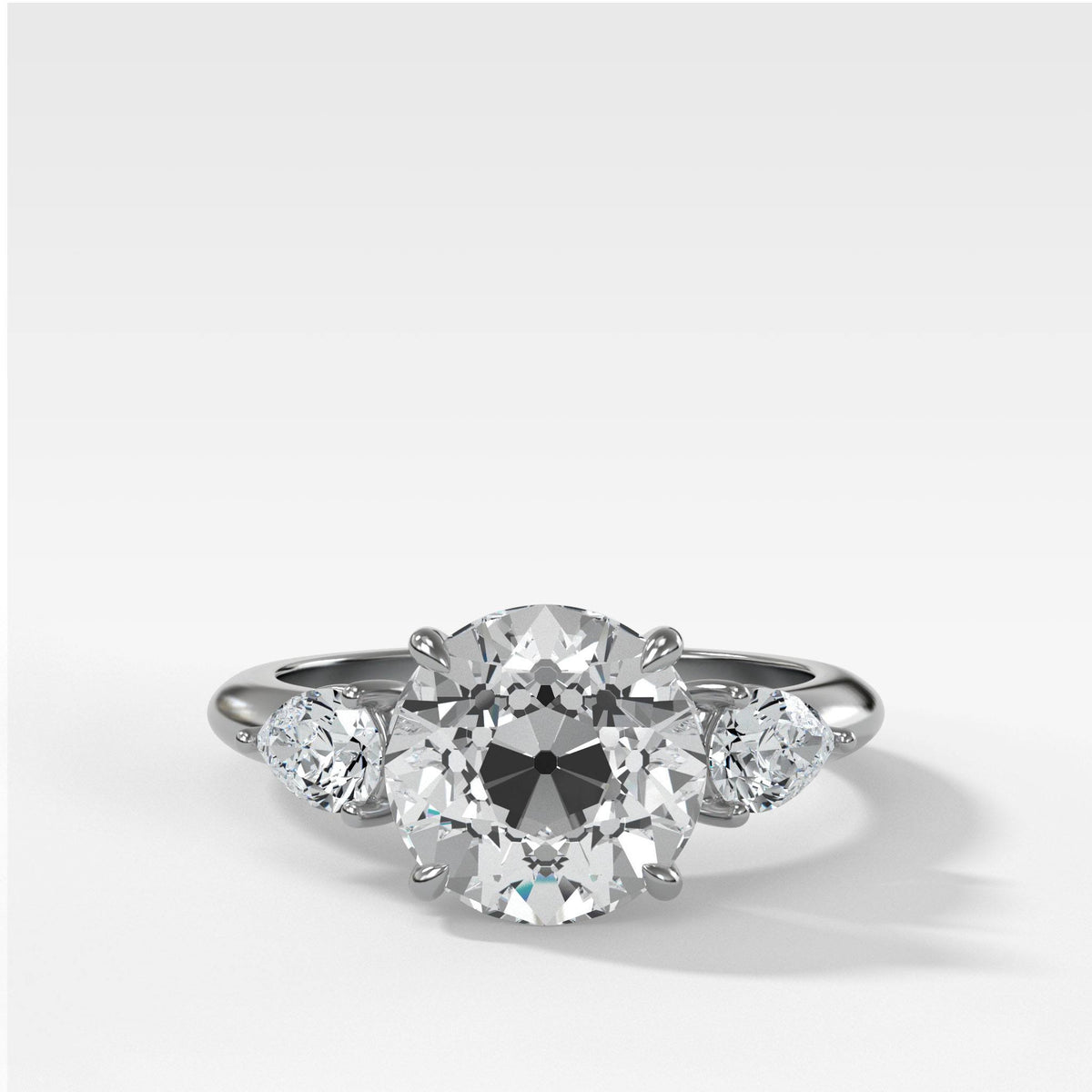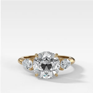 Three Stone Engagement Ring With Pear Side Stones and Old Euro Cut Diamond