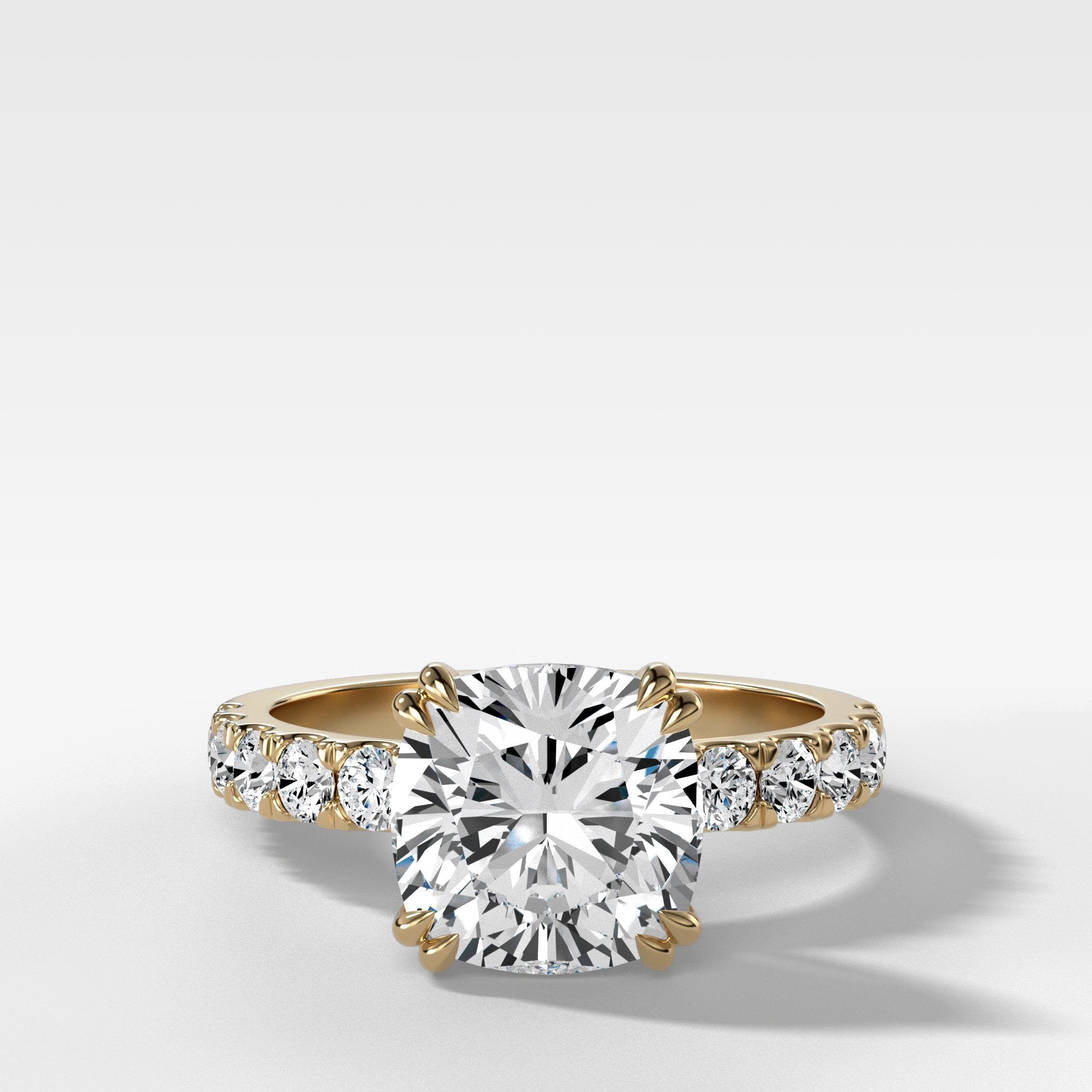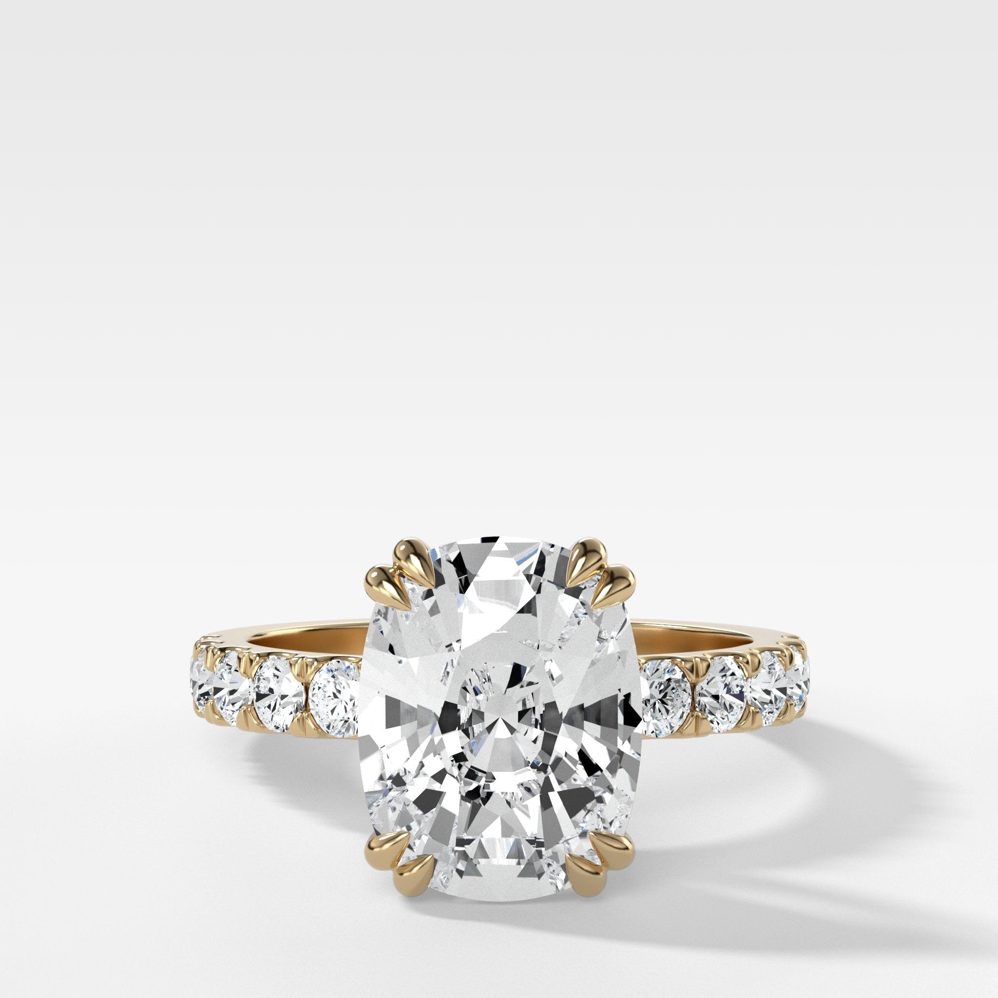 A hidden halo is a subtle yet stunning design feature in an engagement ring where a circle of smaller diamonds is set beneath the center stone, encircling its base. Unlike a traditional halo, which is visible from the top view, the hidden halo is only noticeable from certain angles, such as when viewed from the side or when the ring catches the light. This delicate detail enhances the brilliance of the center stone by reflecting additional light and creating an enchanting sparkle.