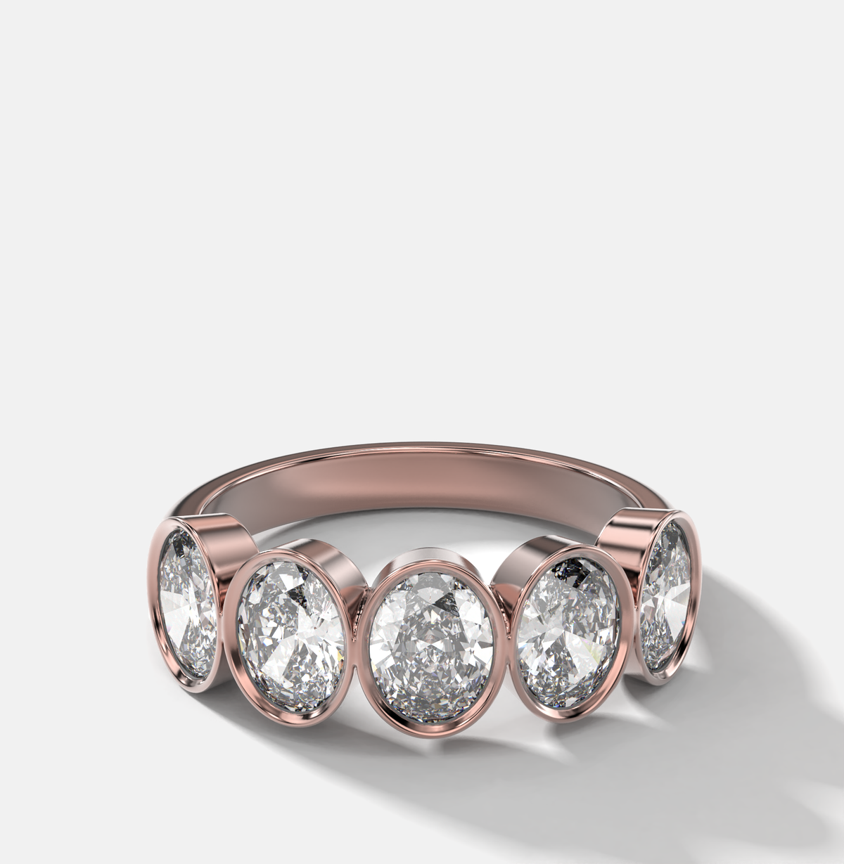 A statement piece comprised of five hand selected Oval Cut diamonds with a border of precious metal.