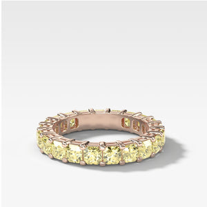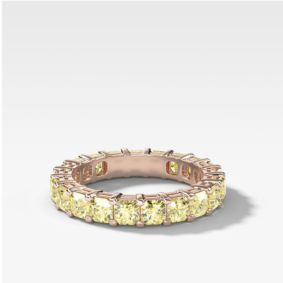 Diamantes de talla radiante: son brillantes en la parte inferior (pabellón) y rectangulares en la parte superior con esquinas recortadas. Agregue un rico tono amarillo canario y obtendrá un anillo espectacular. Presentado como una eternidad completa: 4,50 quilates.