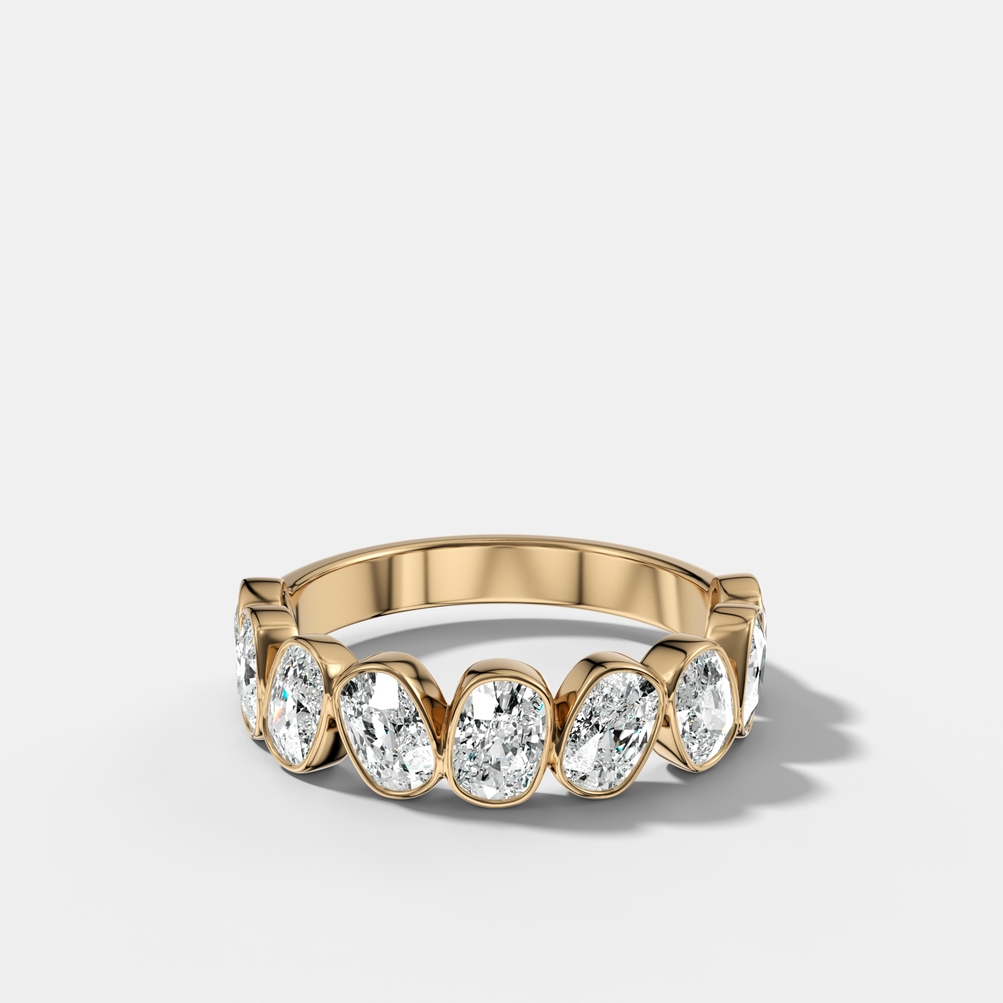 The cushion cut silhouette can be either square or elongated and rectangular, with smooth rounded corners that make for a special faceting offering endless brilliant sparkle. These timeless gems have evolved over centuries from the old mine cut, gaining recognition as one of the most popular and romantic options. The two choices for silhouette also grant designers the ability to craft wedding band styles that fit all tastes.