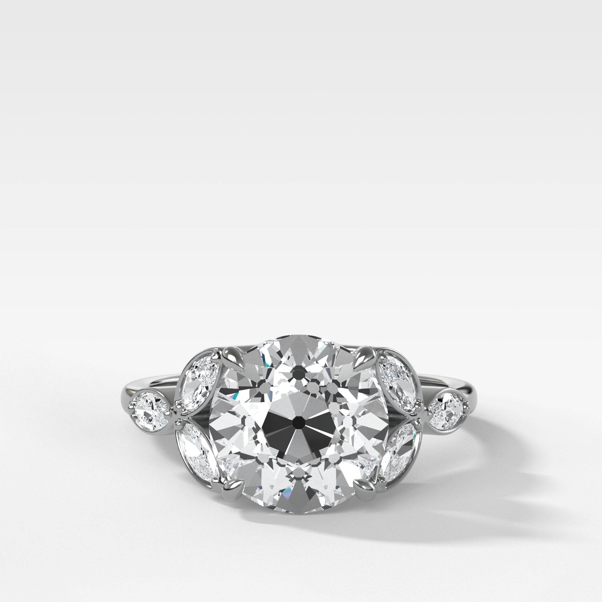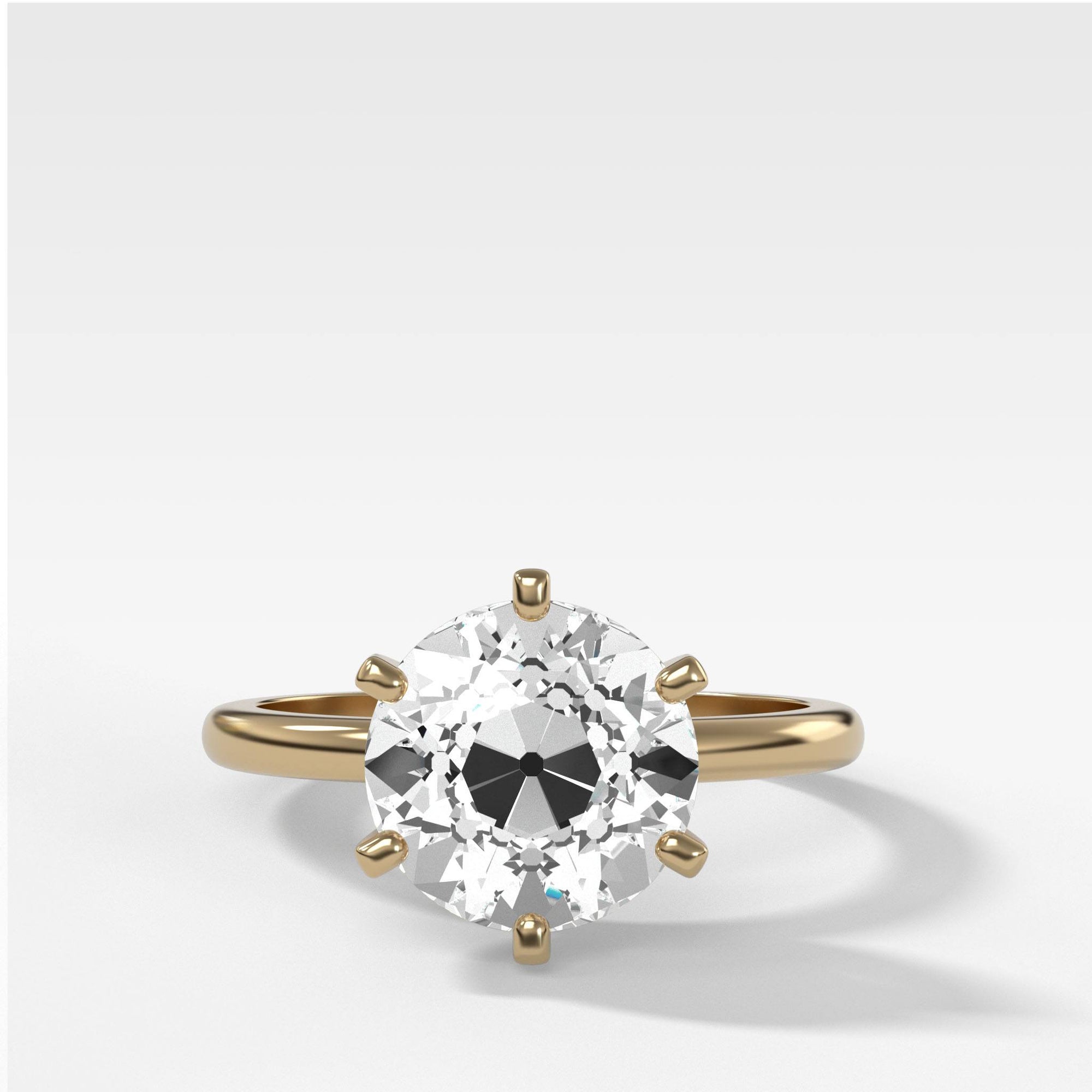 Old European cut diamond engagement rings are cherished for their vintage charm, offering a captivating alternative to the modern round brilliant diamond. These antique treasures boast broader facets that create exquisite floral or checkerboard-like patterns, enhancing the multi-colored flashes of light, known as fire, to shine brilliantly from within the stone. The broader diamond facets not only favor dispersion but also produce softer colors that gracefully emanate from the diamond, adding to their everlasting beauty.