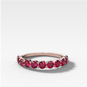 Each of the 11 ideal cut round rubies in this ring shares two bead-head prongs with the stone beside it for maximum proximity and depth of color.
