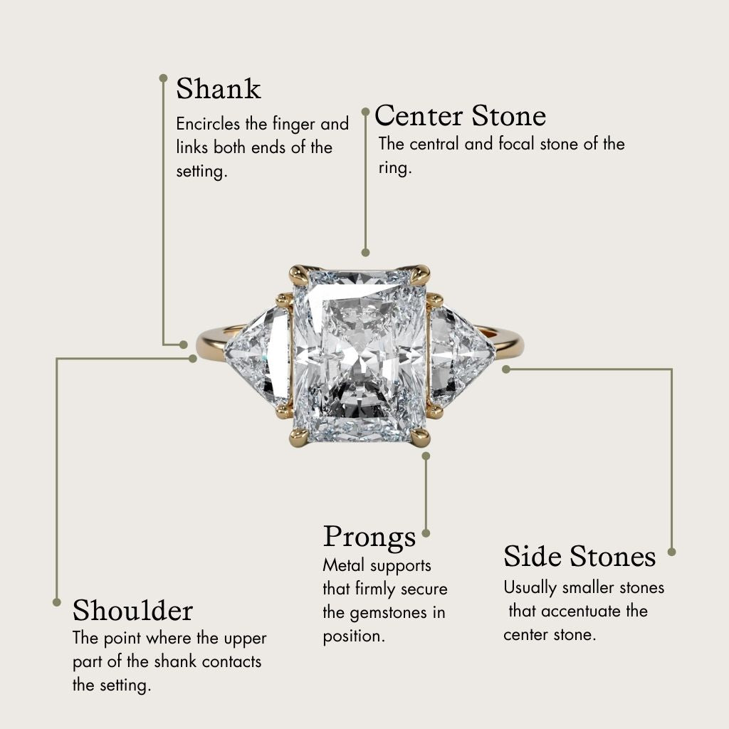 Side Stones: Side stones, which can be diamonds or gemstones, are the smaller stones that sit on the sides of the center gem. They can come in various shapes like shields to accentuate and compliment the center stone.