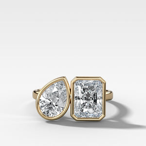 Anillo de compromiso con bisel Toi et Moi, pera y diamantes alargados de talla radiante
