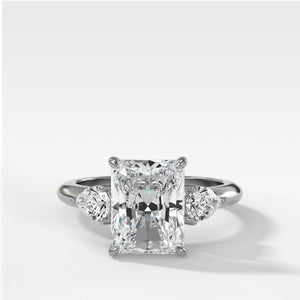 Anillo de compromiso de tres piedras con piedras laterales en forma de pera y diamante alargado de talla radiante