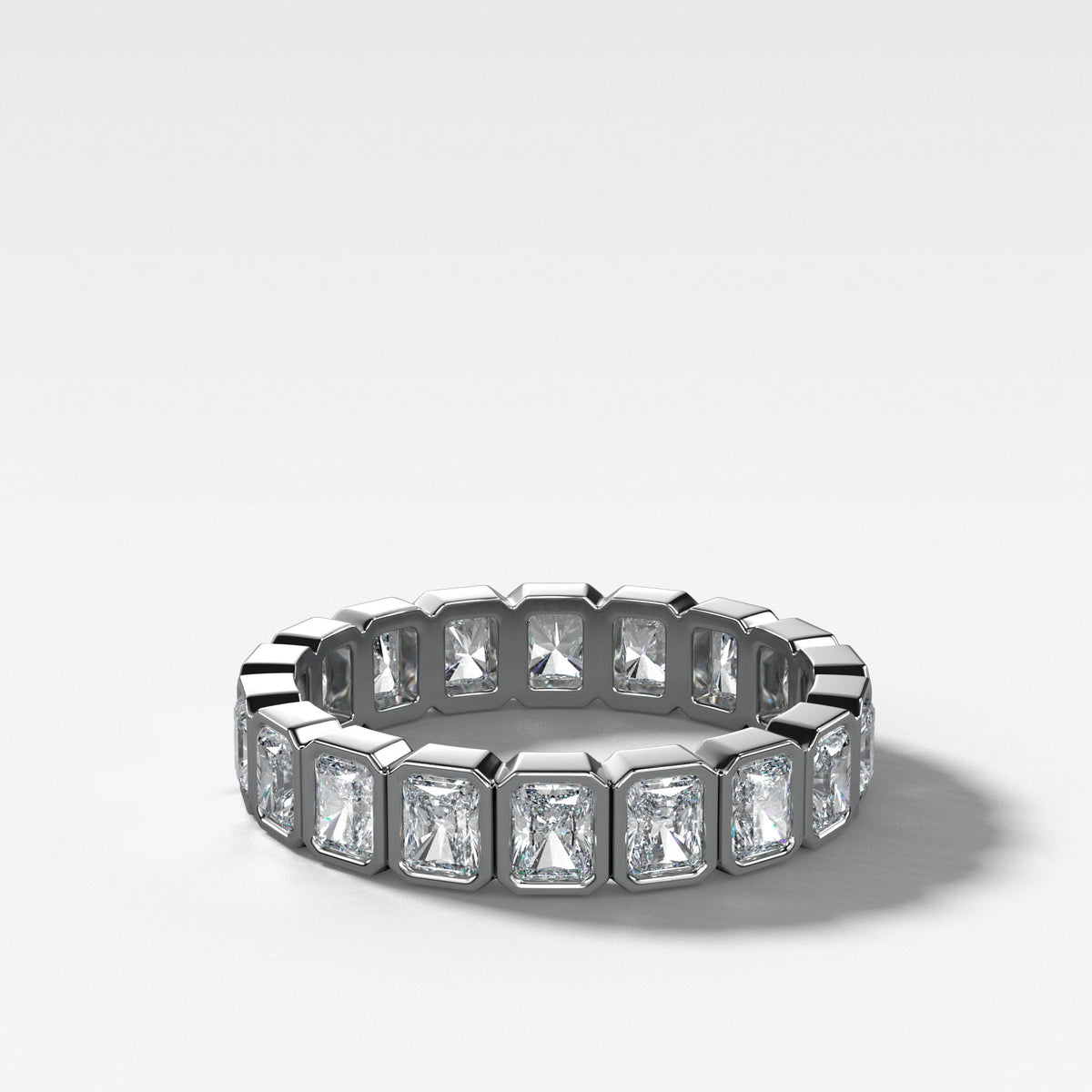 An eternity style band featuring a continuous loop of radiant cut diamonds. Each embraced by their own personal case of gold. The little sibling of the midi bezel set for a more dainty look.