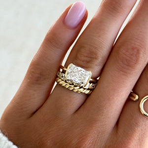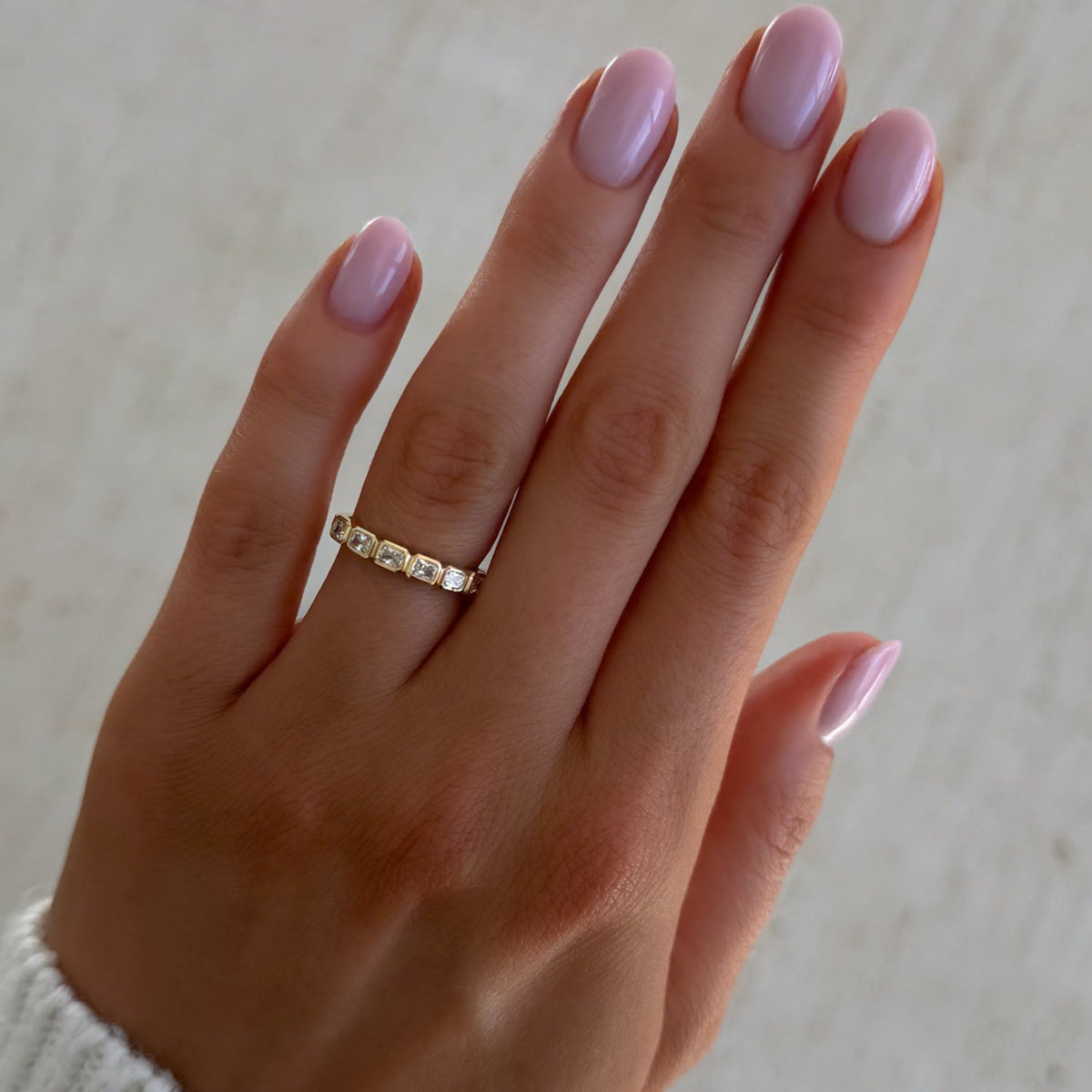 A halfway eternity style band featuring a half loop of radiant cut diamonds. Each embraced by their own personal case of gold. Featured in the horizontal, East West direction.