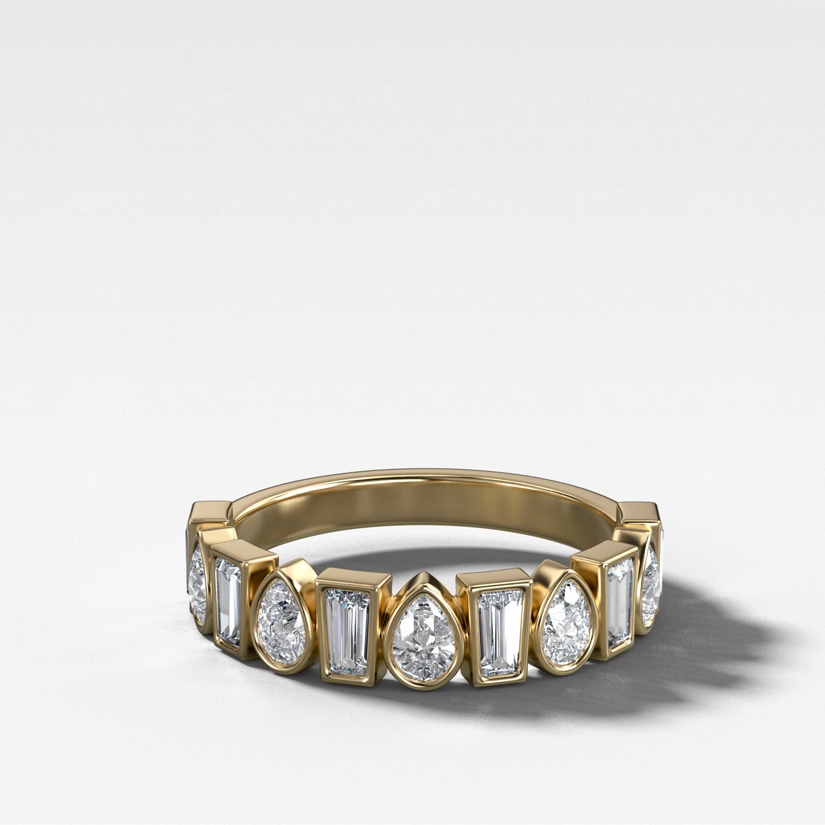 A halfway eternity style band featuring a half loop of pear and tapered baguette diamonds. Each embraced by their own personal case of gold. The little sibling of the midi bezel set for a more dainty look.