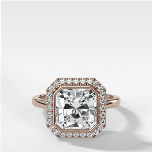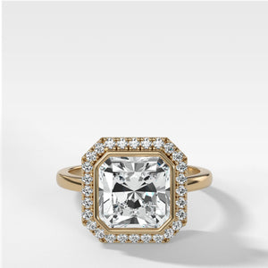 Anillo de compromiso con halo en engarce de bisel y talla cuadrada radiante