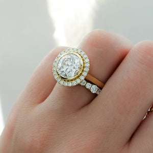 Un número único: una forma de diamante de su elección, mínimamente engastada en un engaste de bisel, rodeada por un halo de pavé. Los diamantes en el vástago son opcionales.