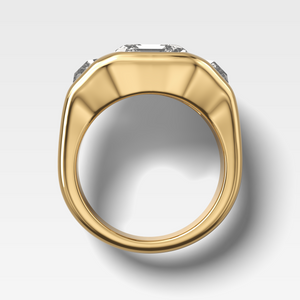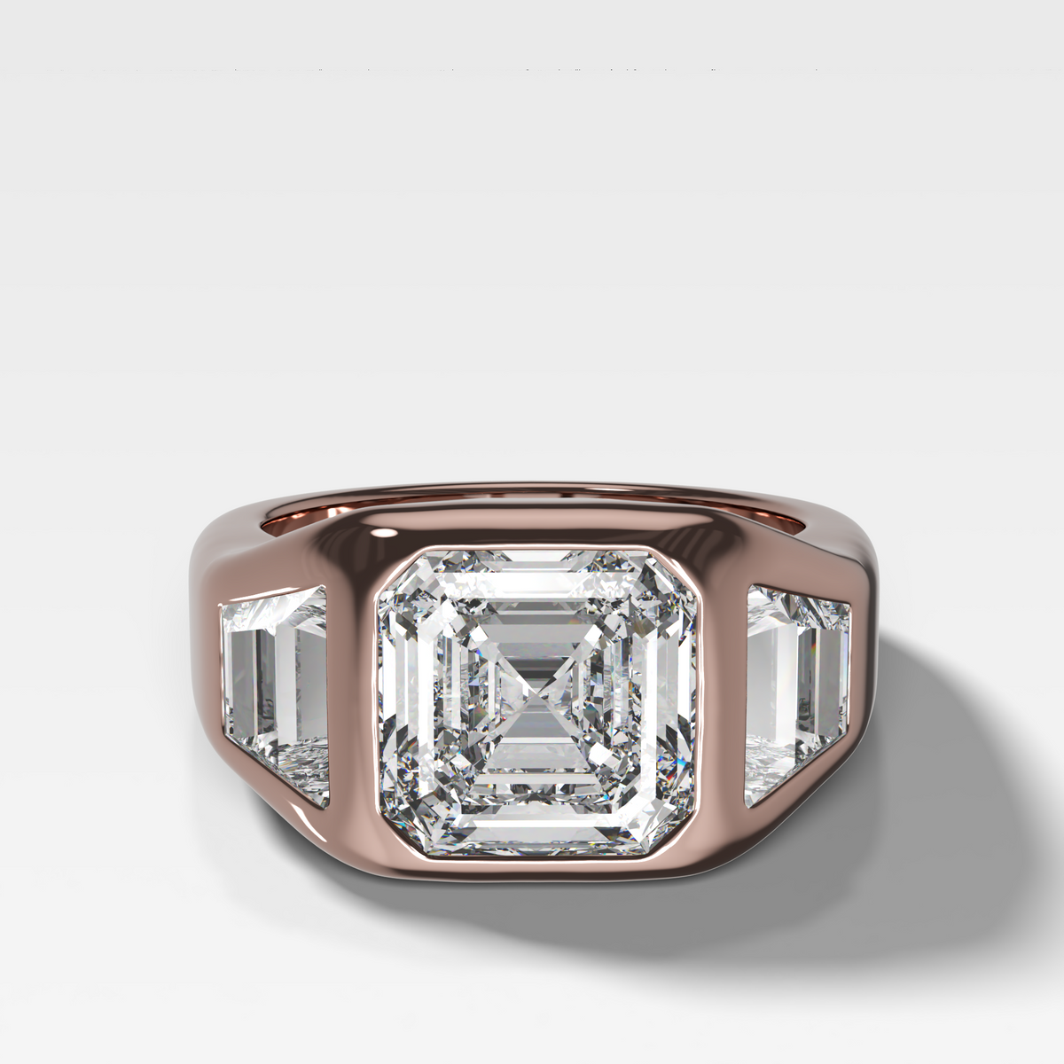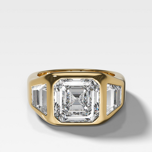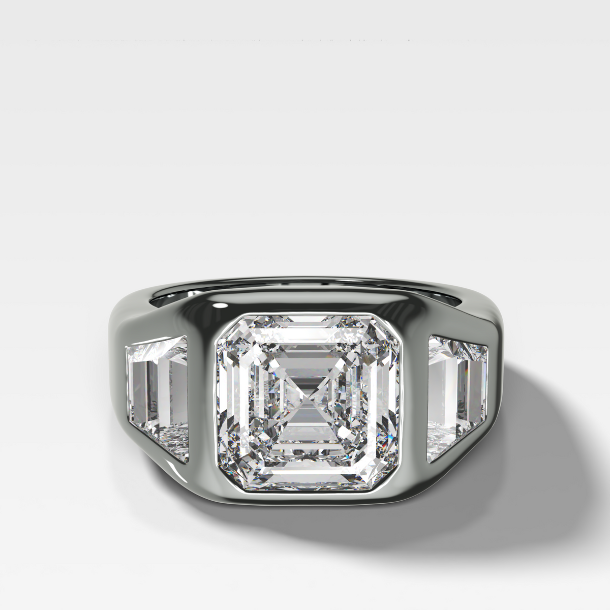 Two trapezoid side stones placed to accentuate the asscher cut all burnished set in a chunky style engagement ring.