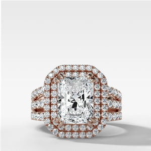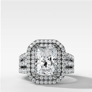 Esta pieza, el anillo más deslumbrante de todos los anillos de compromiso, presenta dos halos personalizados alrededor de la piedra de su elección y tres hileras de diamantes a cada lado.