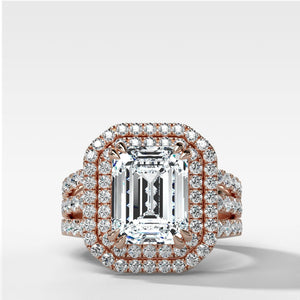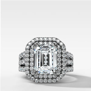Anillo de compromiso con vástago triple y halo doble con talla esmeralda