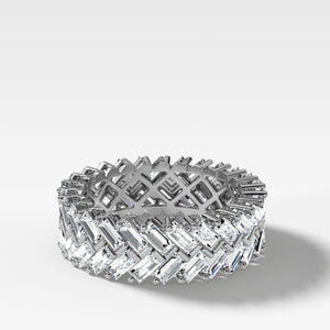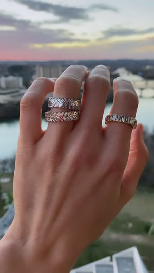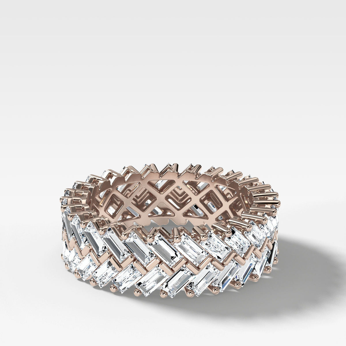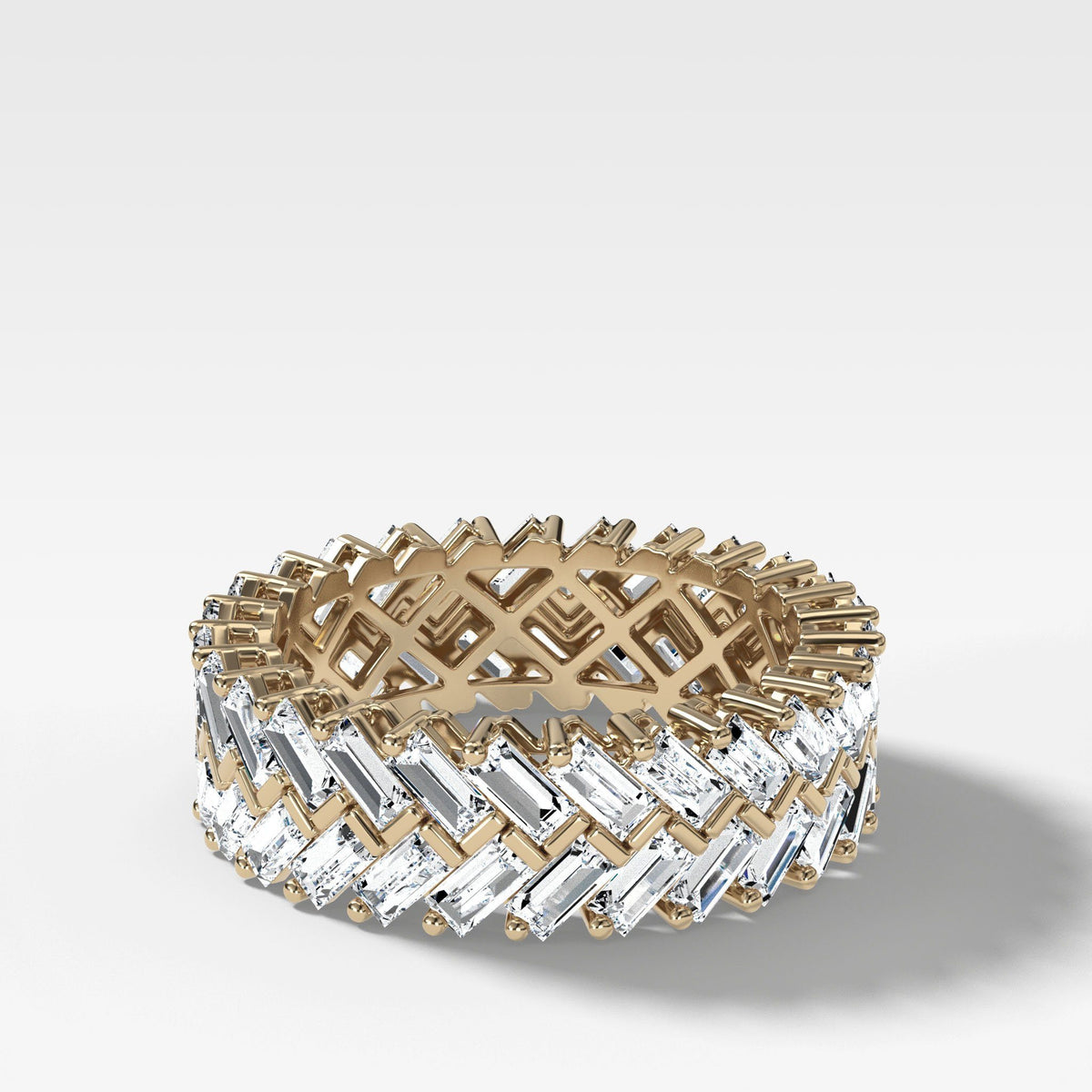 Un diseño de banda histórico, reinventado. Dos filas de baguettes en diagonal iluminan este clásico de la eternidad.