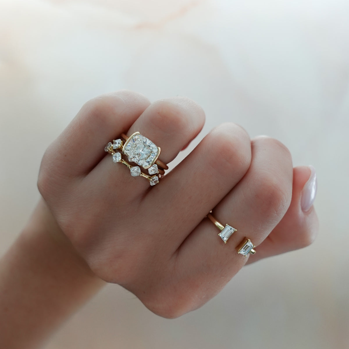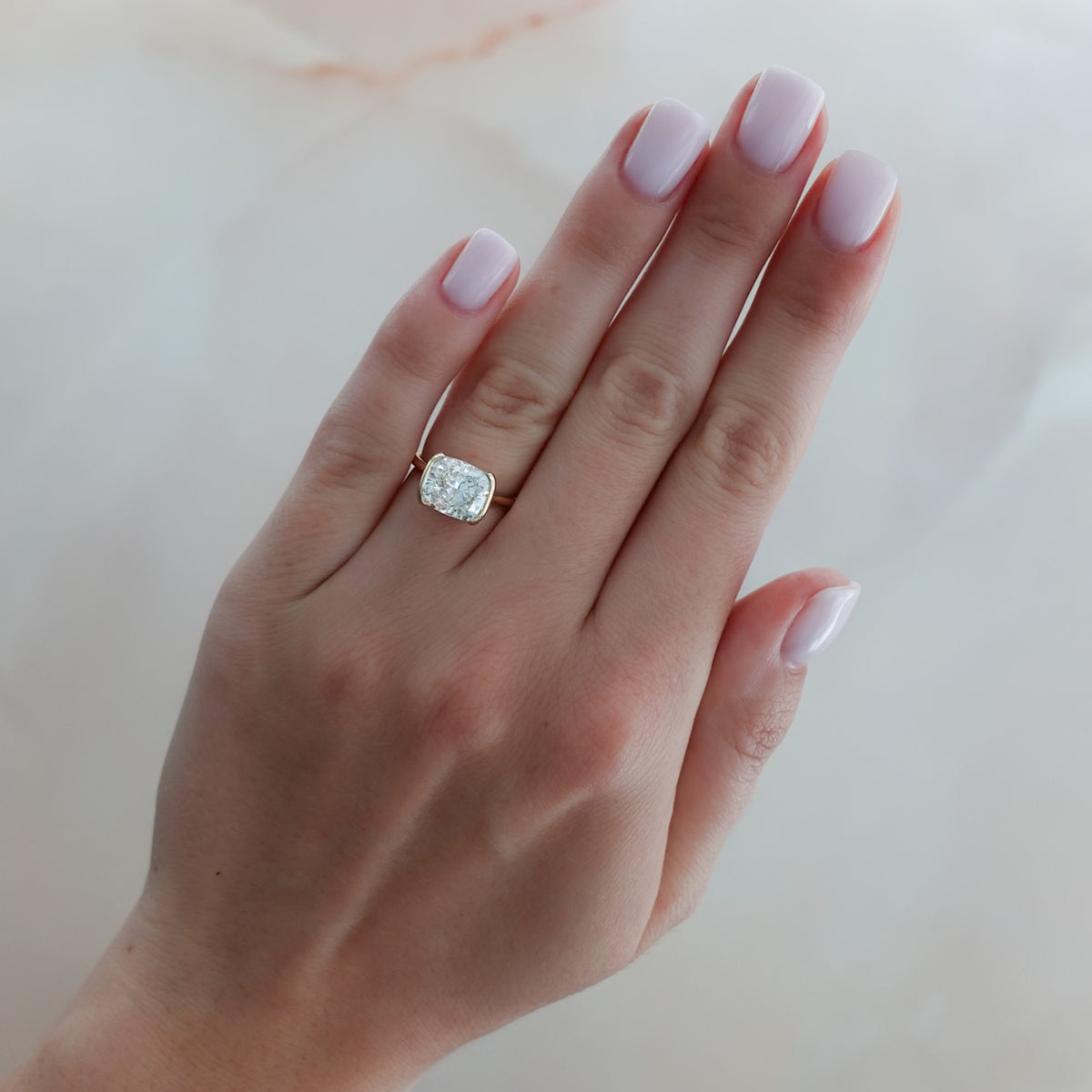 The most minimal ring we've ever designed – two delicate bezel lips protect the diamond's edges.... and that's it. We've left the sides completely exposed so that you may appreciate your diamond from all angles.