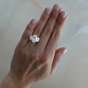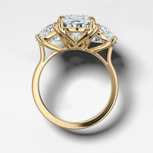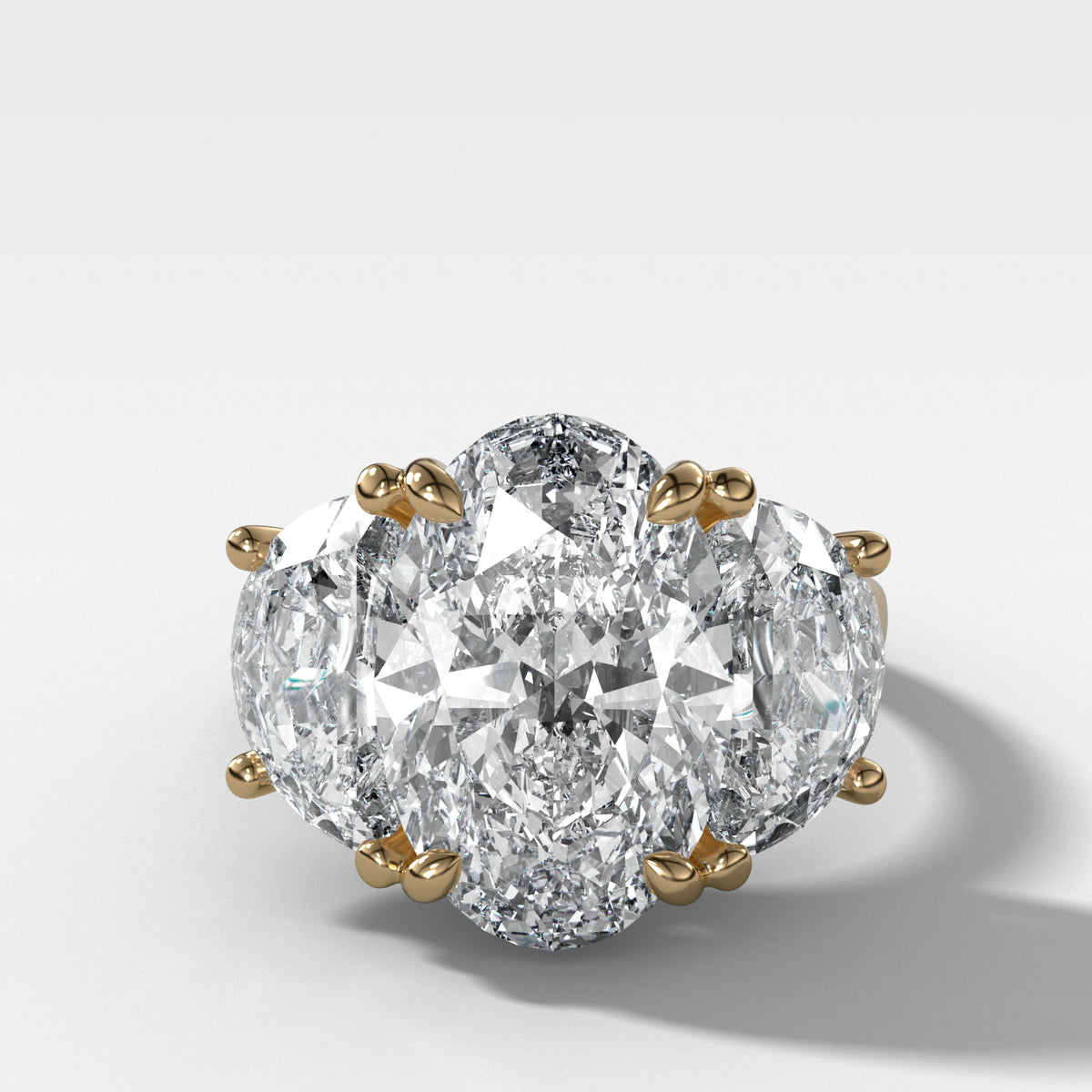 Send ring sizerA classic three stone ring – but make it bigger & better. One Elongated oval flanked by two half moon diamond sides, perfectly matched to your chosen center stone.