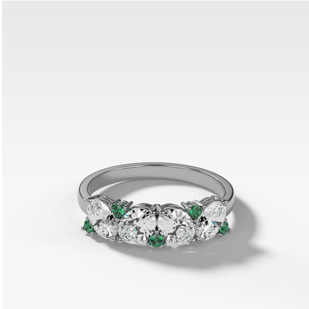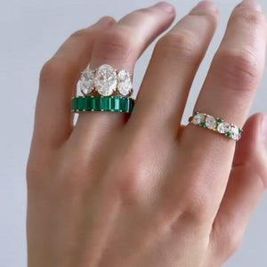 Una impresionante combinación de grandes diamantes ovalados y pequeñas esmeraldas verdes redondas, esta mezcla de gemas sirve como una alternativa elegante a una alianza de boda estándar.