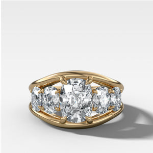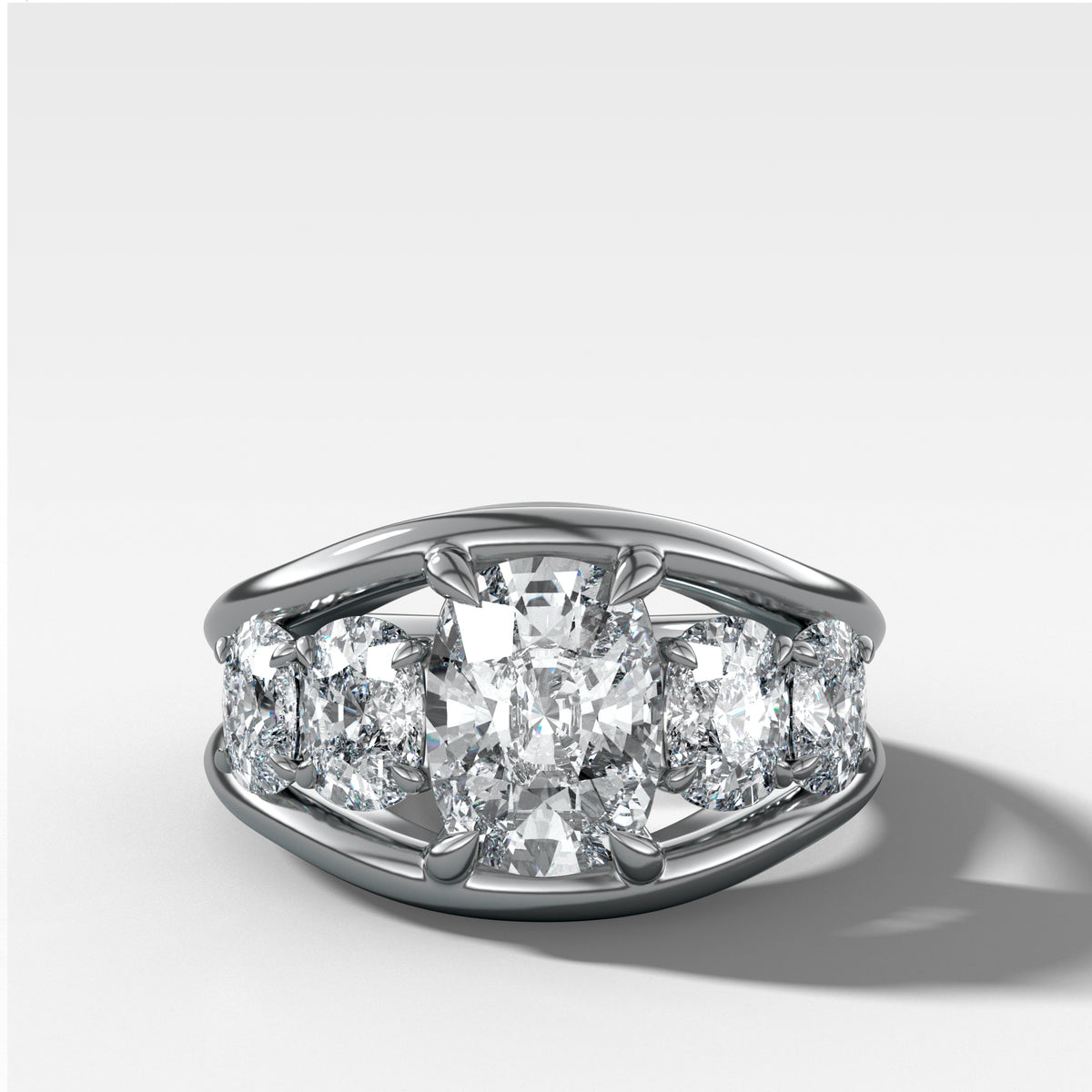 Two curved channels supporting five diamonds for the maximum sparkle, featured here with an Elongated Cushion Cut center.