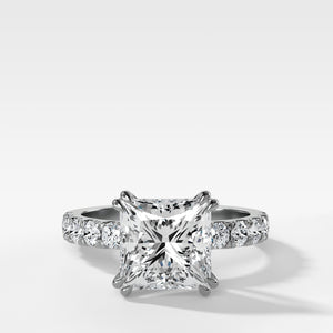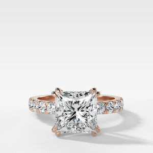 Una llamativa piedra central se complementa con una gran cantidad de pequeños diamantes redondos pavé engastados en el cuerpo, para crear un anillo mínimo con el máximo brillo.