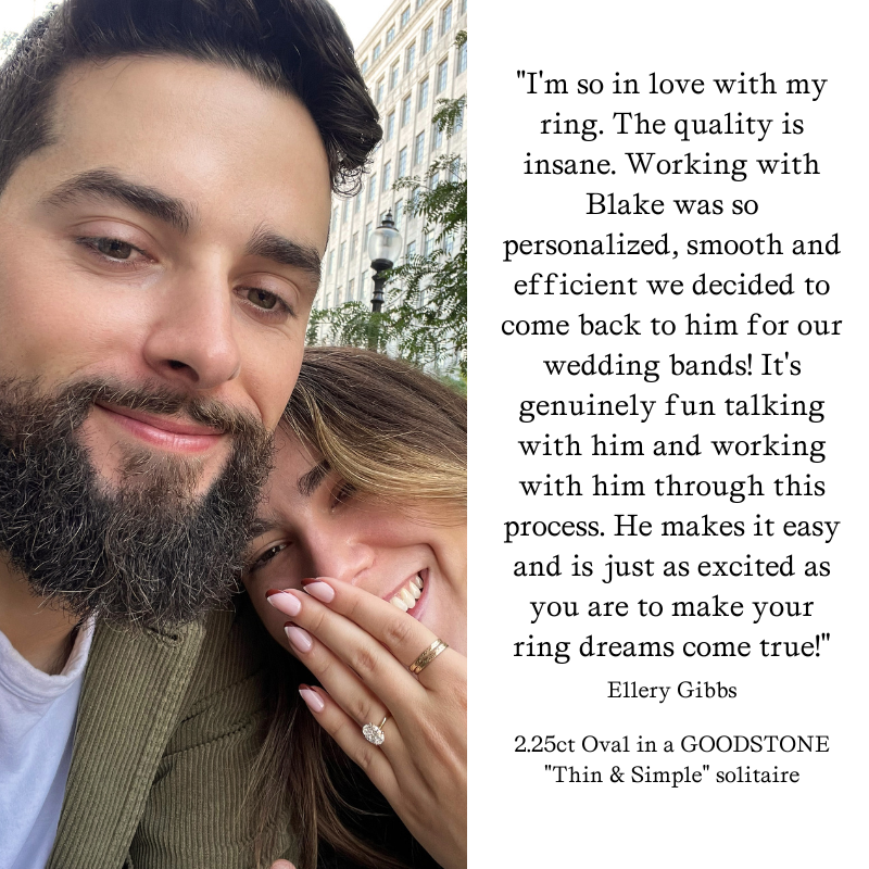 "I couldn’t find what I wanted for my wedding band at our jeweler and I heard great things about GOODSTONE. We reached out to Blake and he was so awesome to work with! He was very knowledgeable and reassuring throughout the whole process. Once completed, it was delivered insanely fast overnight. My band is absolutely stunning and looks perfect with my engagement ring. (I got the petite shared prong band with ovals in rose gold). You won’t regret going with GOODSTONE."