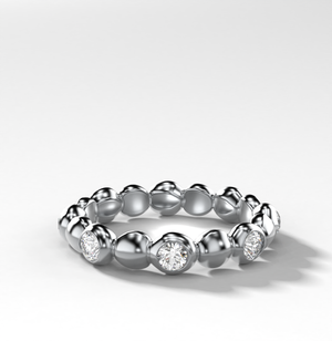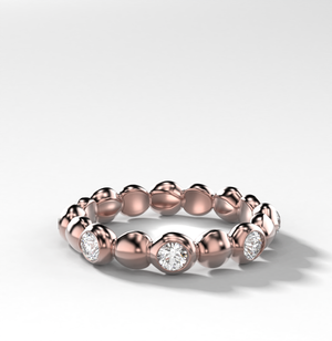 A row of golden bubbles encasing round diamonds, with an organic flow. Featured here in an alternating eternity style, with a diamond in every other bubble.