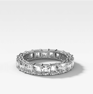 Asscher cuts are so old school, they're new school again. Like an emerald cut but square, this cut is a subtle way to buck the tradition of a round diamond wedding band. Featured here in the full eternity.