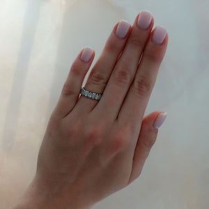 An eternity style band featuring a continuous loop of pear and tapered baguette diamonds. Each embraced by their own personal case of gold. The little sibling of the midi bezel set for a more dainty look.