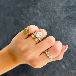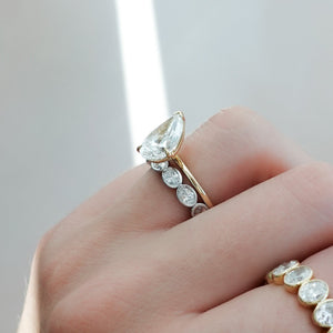 An eternity style band featuring a continuous loop of oval cut diamonds. Each embraced by their own personal case of gold. The little sibling of the standard bezel set for a more dainty look.