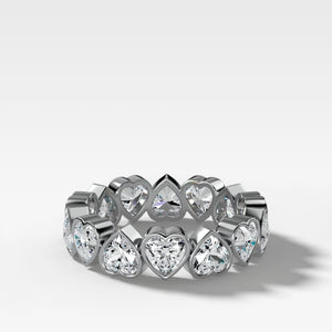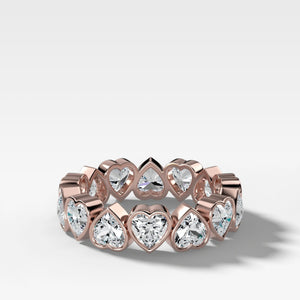An eternity style band featuring a continuous loop of alternating heart shape cut diamonds. Each embraced by their own personal case of gold.