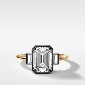 Send ring sizerA classic three stone ring set on a 2.40mm wide band, featuring one Emerald Cut diamond flanked by two straight baguette sides.