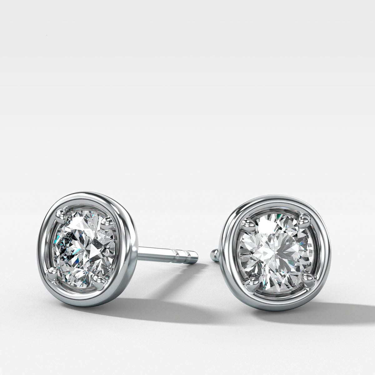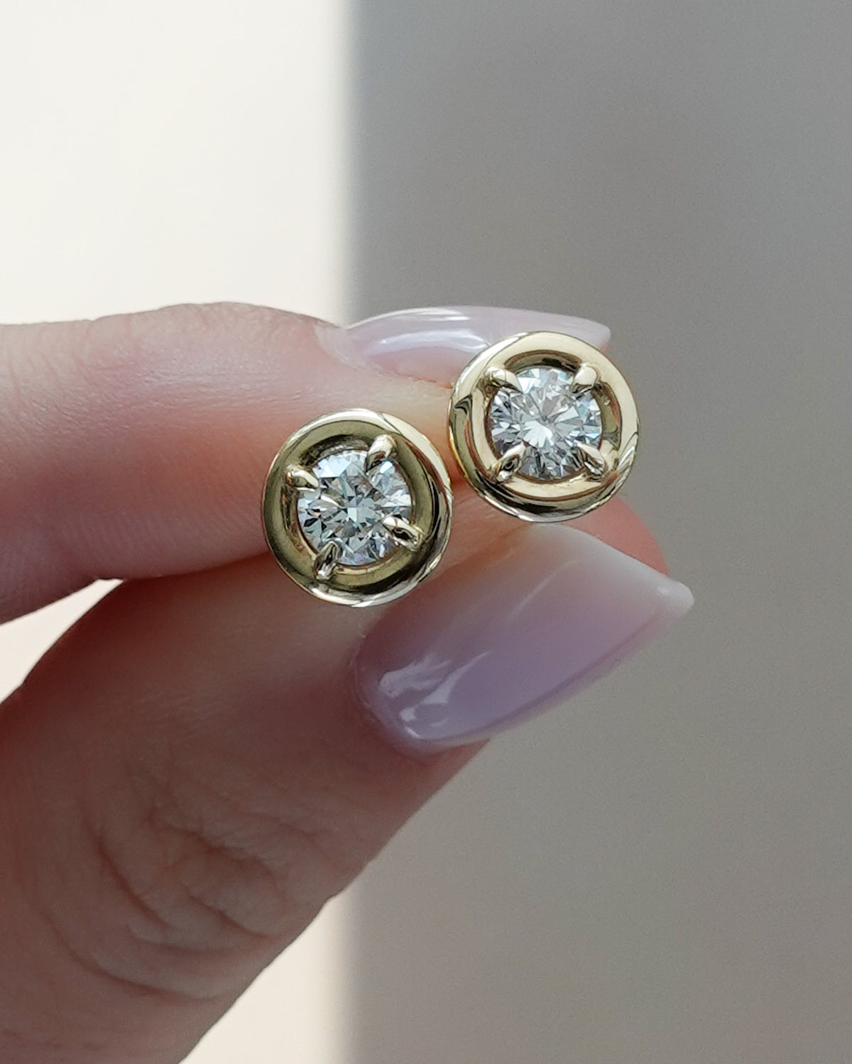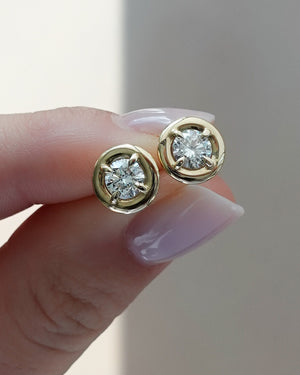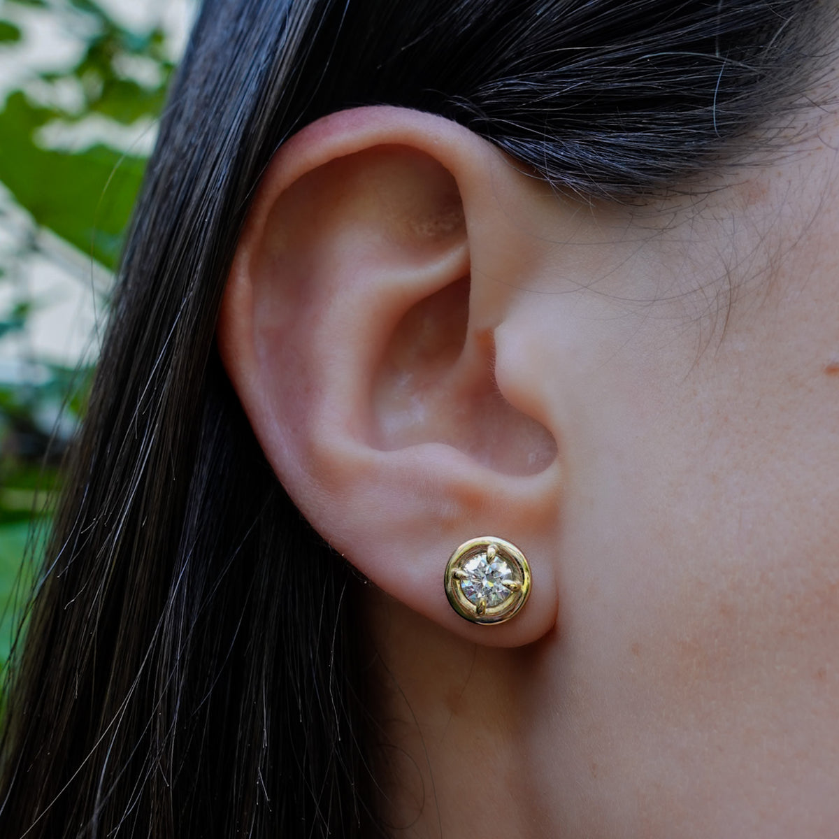 Our diamond club earrings feature a brilliant diamond in a chunky bezel setting with pointed prongs, having a button like appearance.