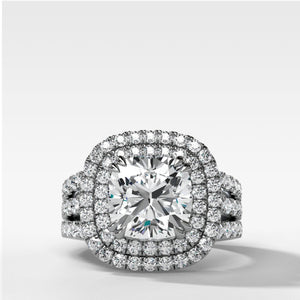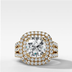 Double Halo Triple Shank Engagement Ring With Cushion Cut Diamond