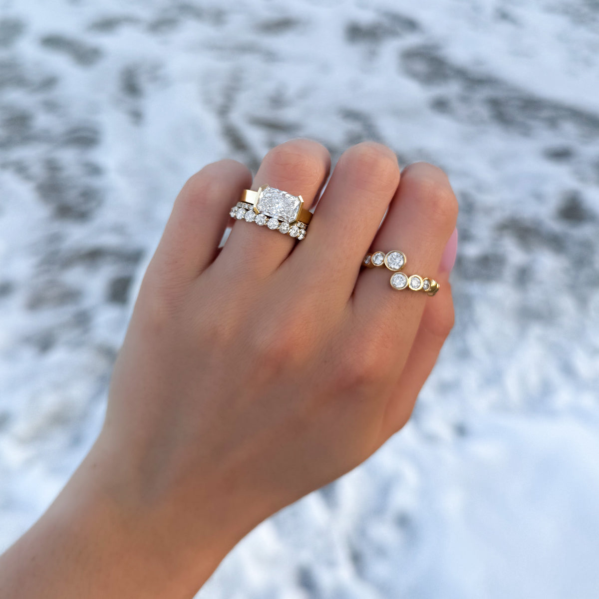 A combination of our classic Half Bezels & Finest Solitaires. 3.5mm of precious gold in a flat band, its the newest sleek solitaire ring.