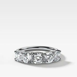 The cushion cut diamonds in this shared prong ring sit close and shine bright. Five gorgeous stones with soft corners, it's a classic shape that'll age well.