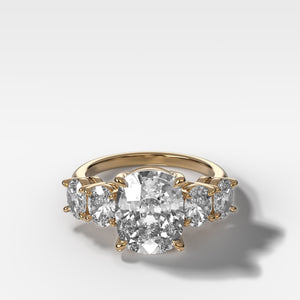 A large diamond is flanked by four smaller gems, all set in single claw prongs: simply, elegantly jaw-dropping. Featured here with an elongated cushion as the center stone, and four oval diamonds.
