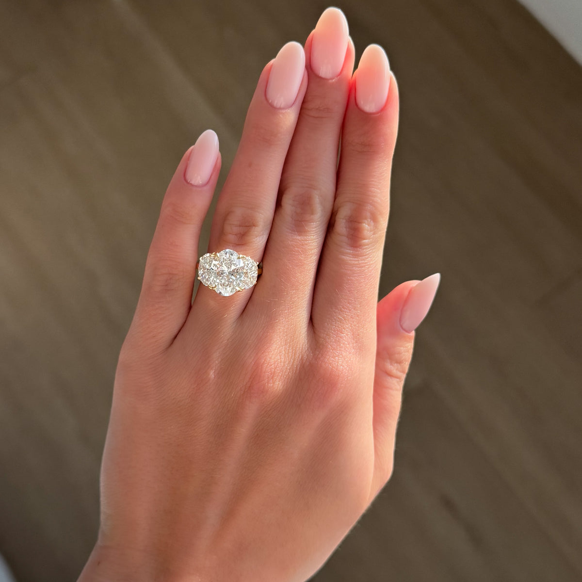 Send ring sizerA classic three stone ring – but make it bigger & better. One Elongated oval flanked by two half moon diamond sides, perfectly matched to your chosen center stone.
