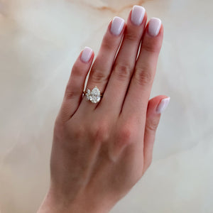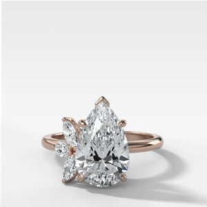 Send ring sizerOur Lotus ring is an asymmetrical engagement ring with two Marquise Cuts and a single round on one side of the center.