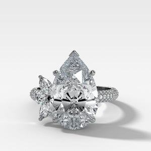 Send ring sizerOur Lotus ring is an asymmetrical engagement ring with two Marquise Cuts and a single round on one side for the center. Featured here with three rows of pavé on the band, full eternity style.